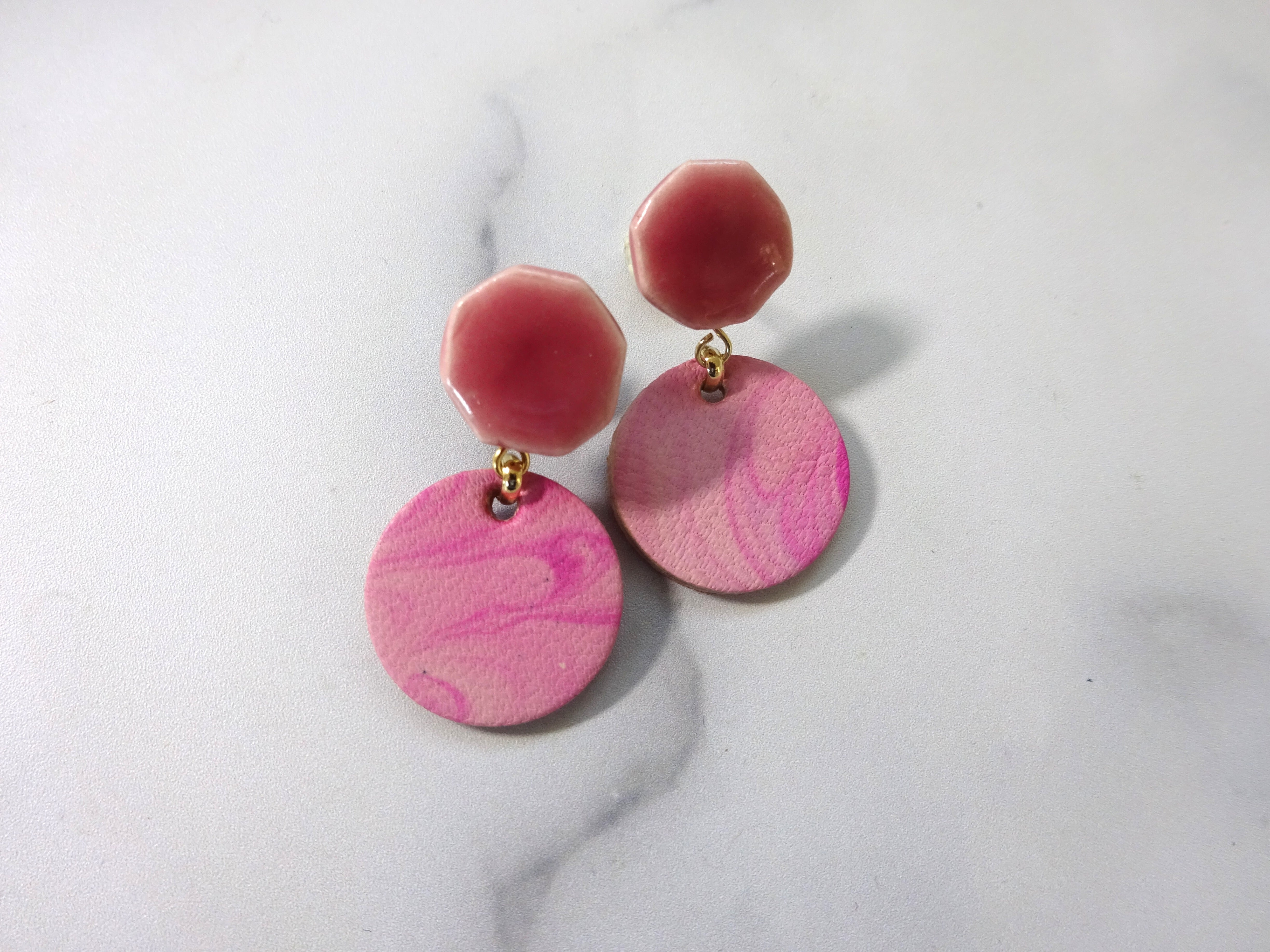 八角形に手作業で形成した陶には鮮やかな釉薬をかけ、揺れる丸形のレザーはマーブリング技法を用いて