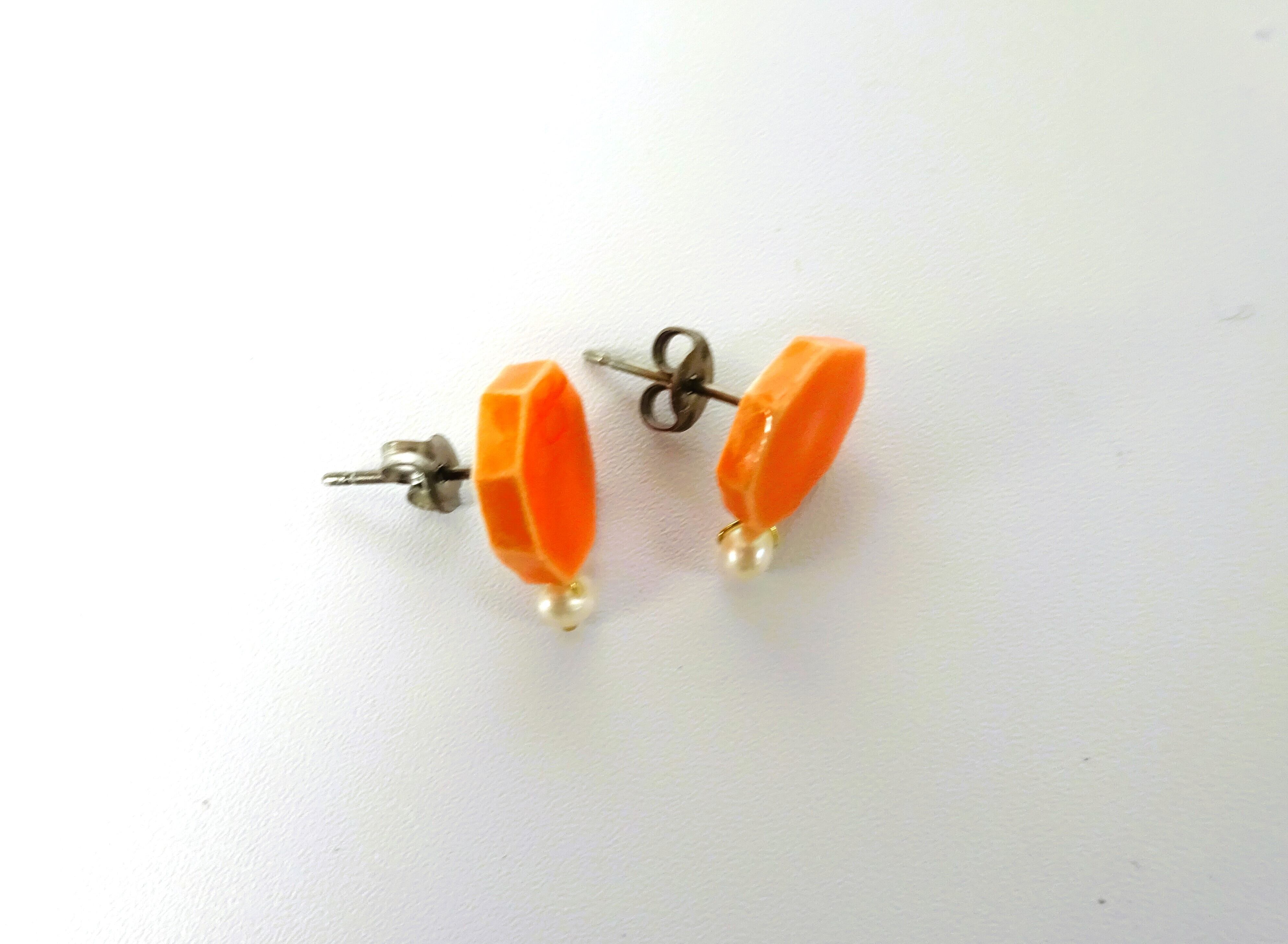 小さな六角 と小さな淡水パールの陶pierce/earring(オレンジ)