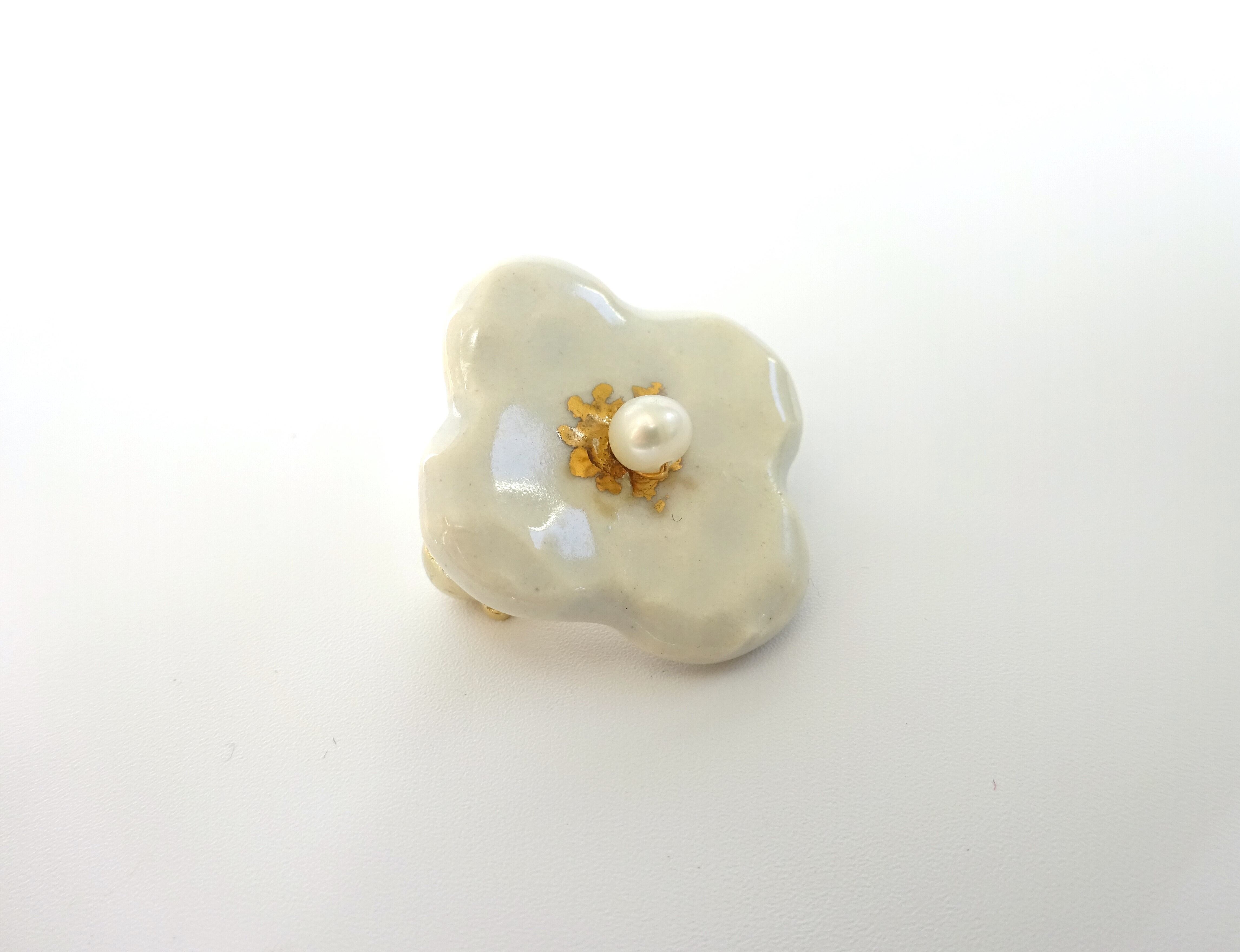 淡水パールを花芯に配した小さな陶のブローチです。
