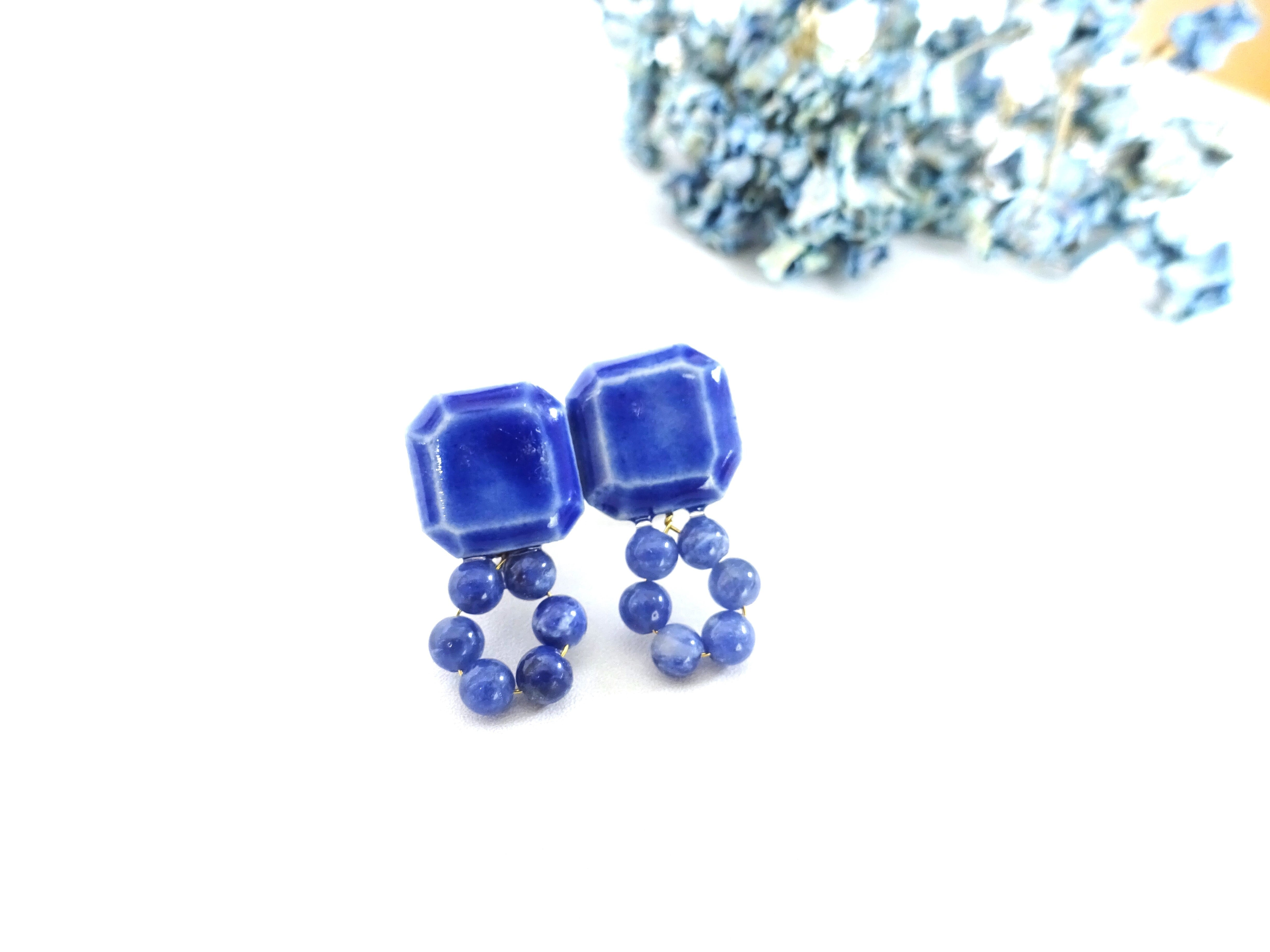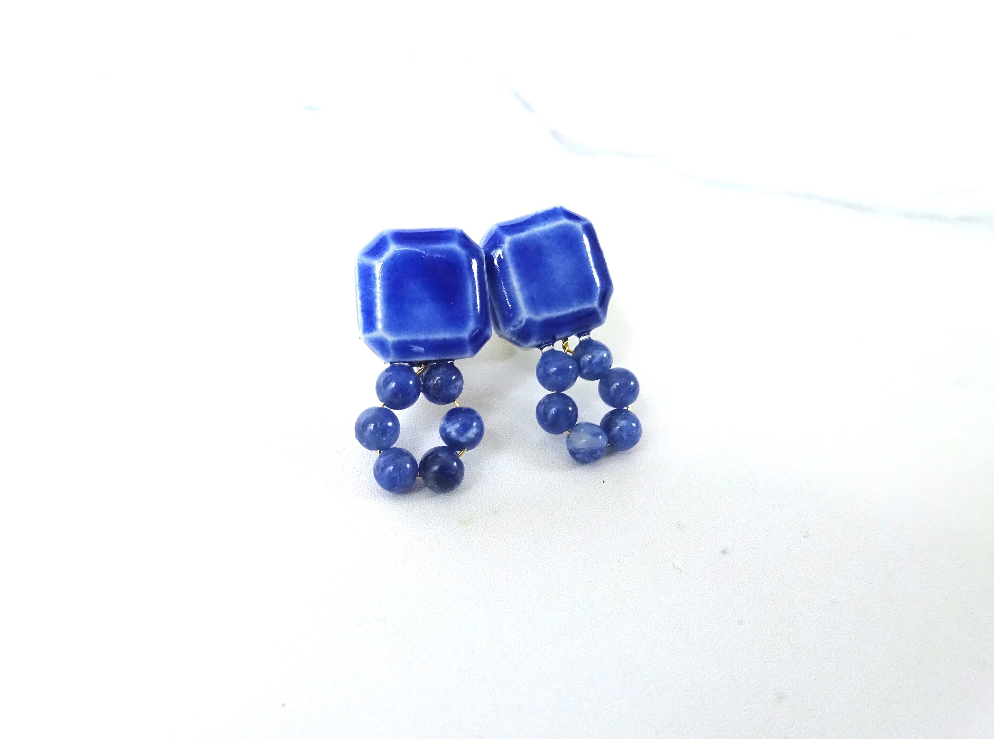 陶とソーダライトのコントラストがいきいきとしたデザインのピアスです。