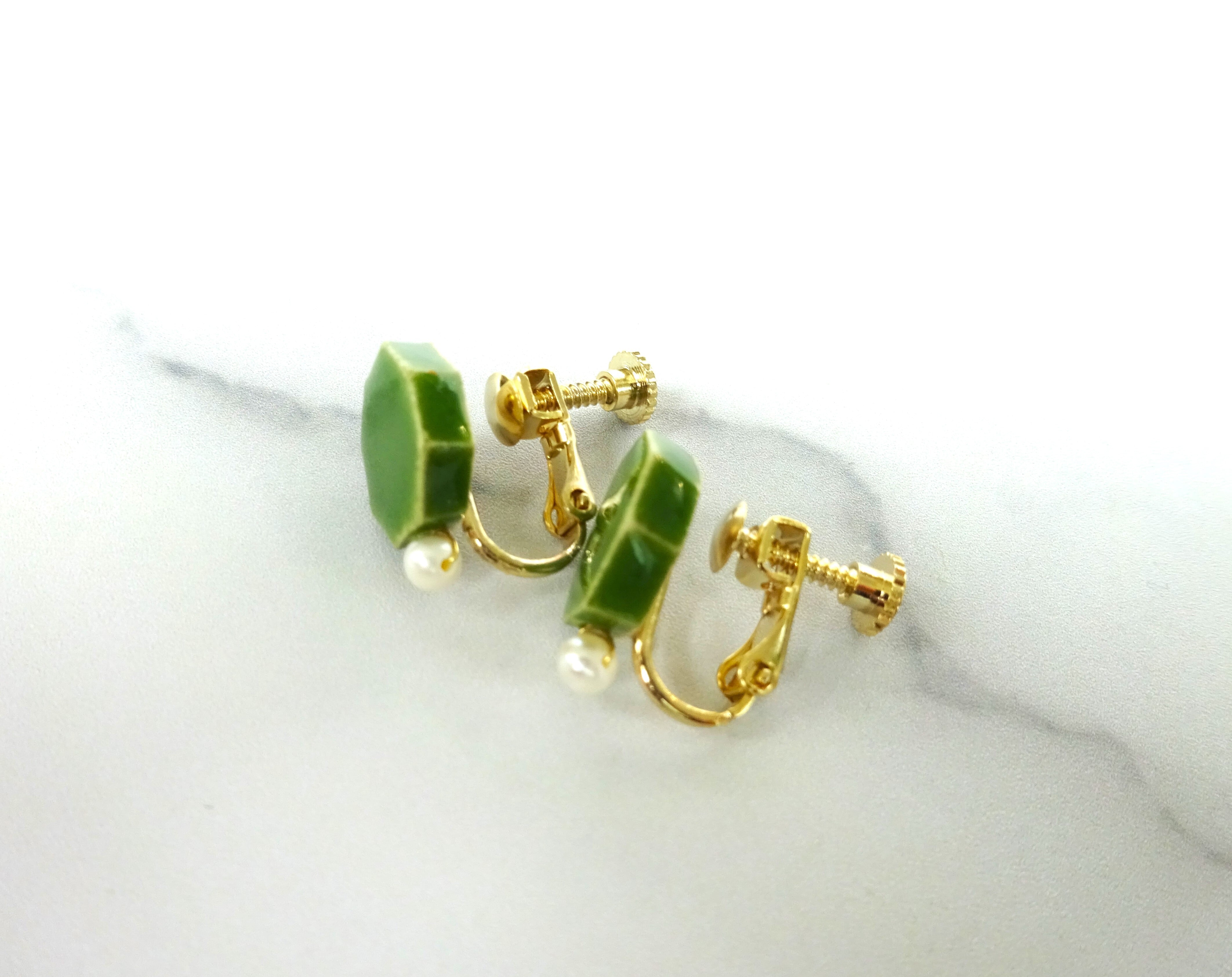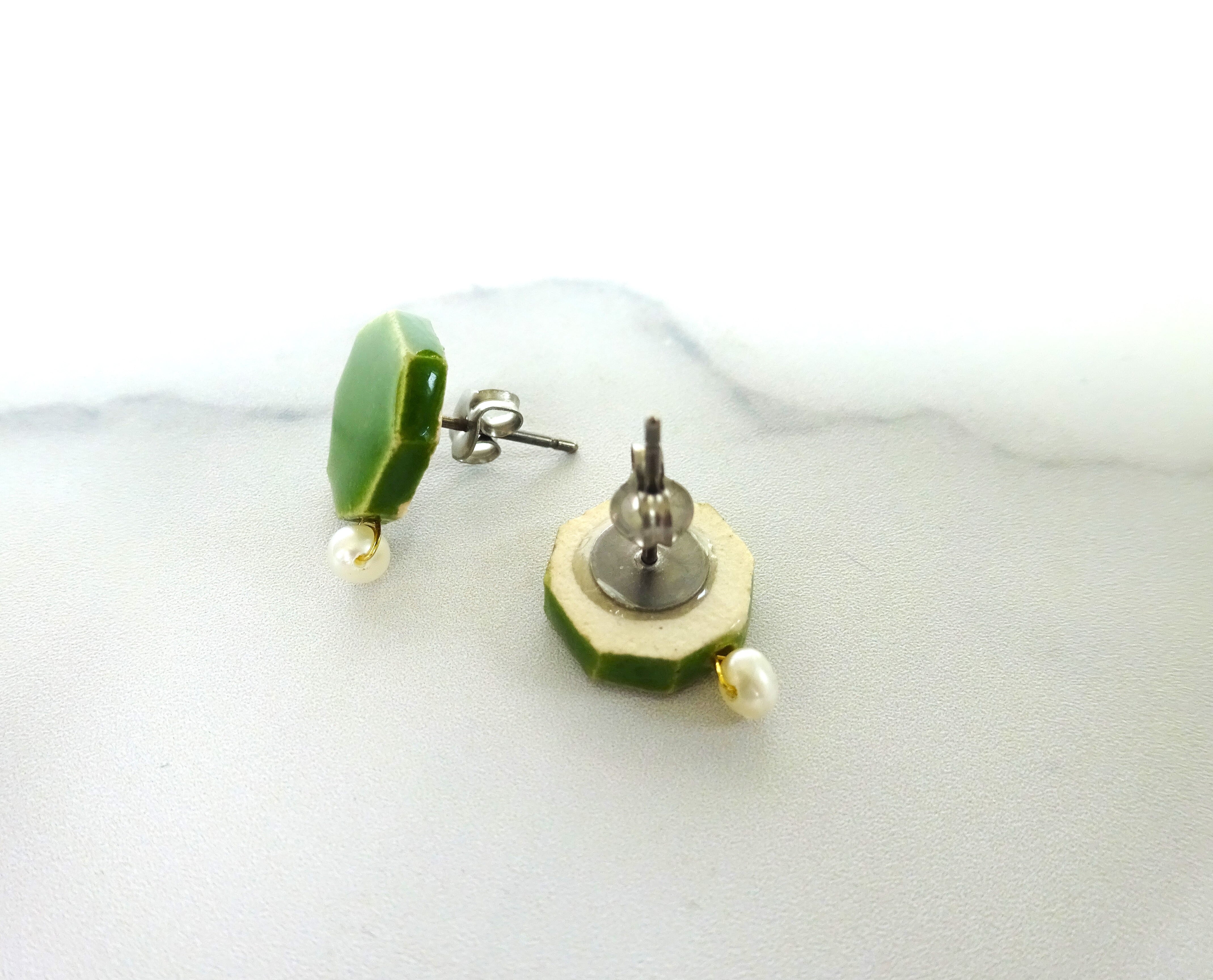 小さな六角 と小さな淡水パールの陶pierce/earring(萌黄色)